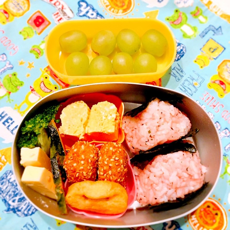 1歳児のお弁当メニュー アンパンマンおにぎりとかぼちゃのコロッケ しゅふろぐ