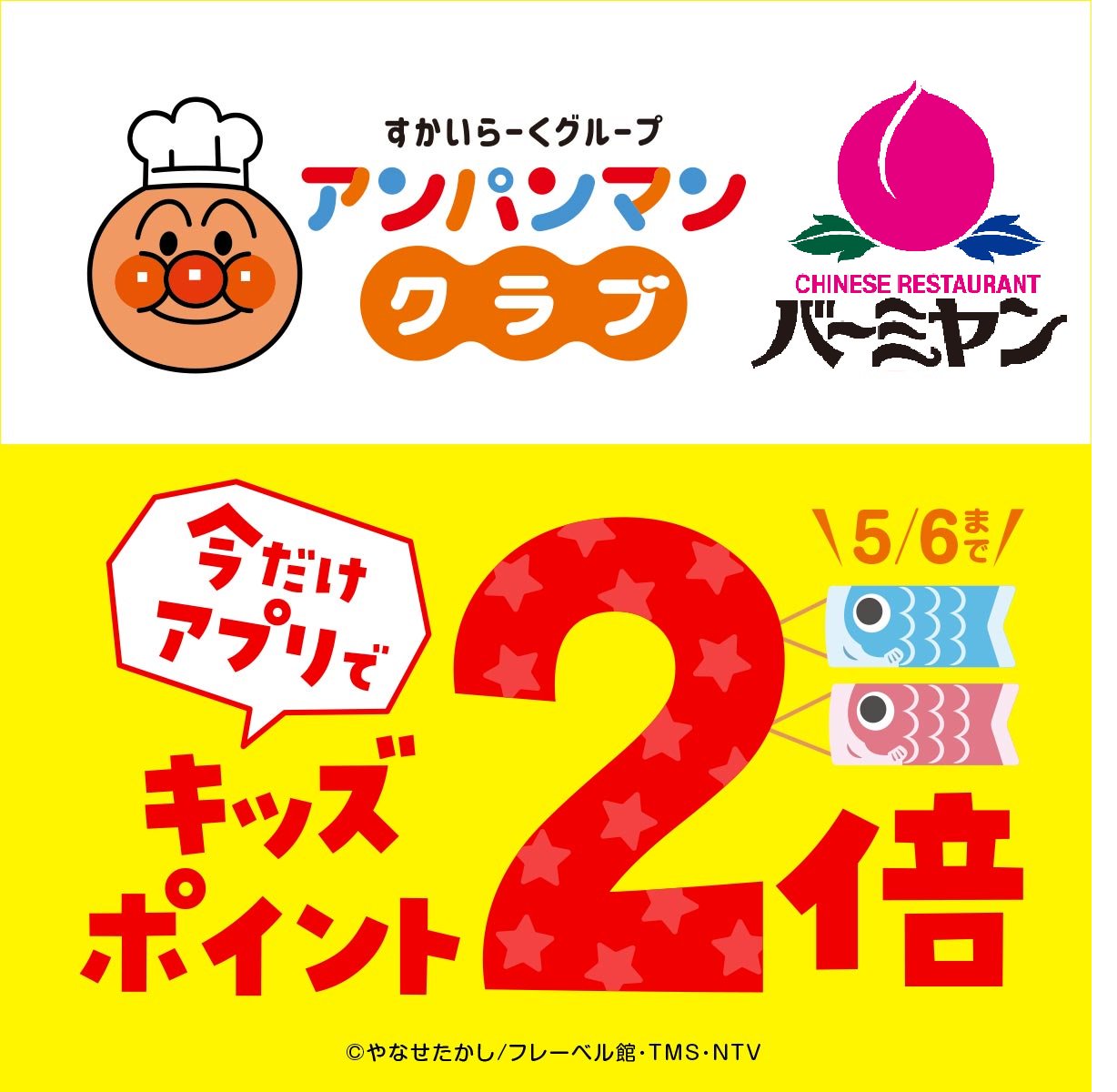 バーミヤン 公式 on twitter アンパンマンクラブ ポイント2倍 すかいらーくアプリのクーポンをご提示で ポイントを2倍プレゼント ポイントを貯めればすかいらーくオリジナルの アンパンマングッズと交換できます 5月6日まで すかいらーくアプリをお