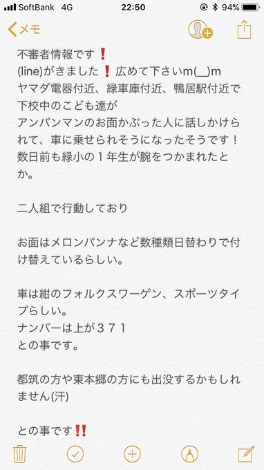 bellnto on twitter 横浜市 緑区 中山 不審者 拡散希望 横浜市緑区中山周辺での不審者情報です 緑車庫付近 鴨居駅付近で下校中の小学生がアンパンマンのお面かぶった人に話しかけられ車に乗せられそうになりました お面は数種類あるよう 紺の