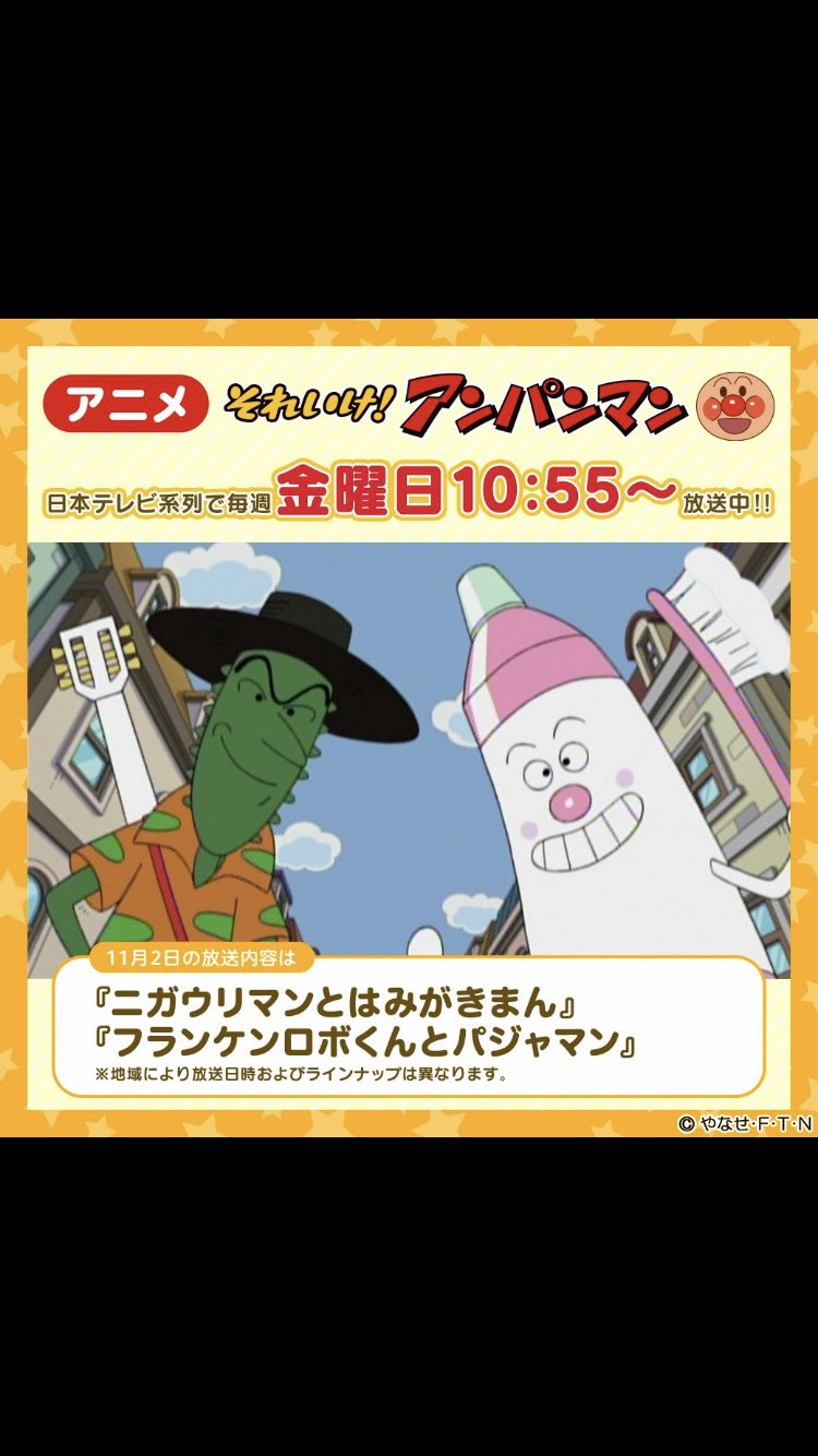 神沢ミホ a twitter 11月2日10時55分 日テレ それいけ アンパンマン ニガウリマンとはみがきまん aパートの脚本を担当しました 歯磨き苦手なお子さんも そうじゃない人もぜひご覧下さい